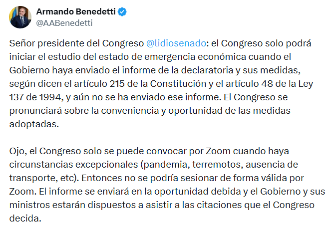 Según Benedetti, el Congreso solo puede pronunciarse cuando el Gobierno haya remitido formalmente el informe con las razones de la declaratoria y las medidas adoptadas. “El Congreso solo podrá iniciar el estudio del estado de emergencia cuando el Gobierno haya enviado el informe de la declaratoria y sus medidas, como lo establecen el artículo 215 de la Constitución y el artículo 48 de la Ley 137 de 1994”, afirmó el ministro.
