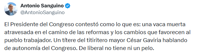 A la controversia se sumó el ministro de Trabajo, Antonio Sanguino, quien lanzó fuertes críticas contra el presidente del Congreso. “Una de dos: o el presidente del Congreso no conoce la Ley Quinta, cosa que es grave; o la conoce y prevarica, cosa que es aún más grave”, afirmó. Posteriormente, en redes sociales, fue más allá y calificó a García como una “vaca muerta” que ha frenado las reformas del Gobierno.