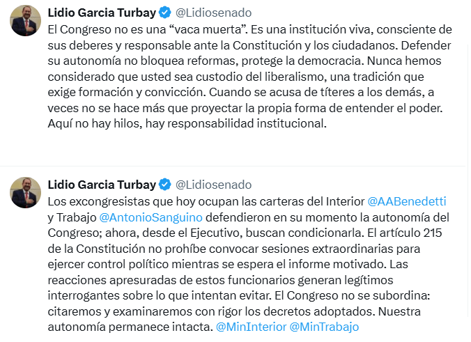 Las declaraciones generaron una respuesta inmediata del presidente del Senado, quien defendió la autonomía del Legislativo y rechazó cualquier intento de condicionamiento por parte del Ejecutivo. A través de sus redes sociales, García sostuvo que la Constitución no prohíbe convocar sesiones extraordinarias para ejercer control político mientras se espera el informe motivado del Gobierno.
