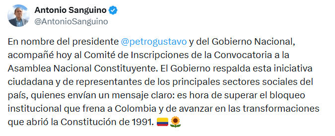 Durante el acto de inscripción, el ministro de Trabajo, Antonio Sanguino, afirmó que la iniciativa busca abrir un camino institucional para destrabar las reformas impulsadas por el Gobierno. Según el funcionario, el respaldo ciudadano permitiría “desbloquear institucionalmente la posibilidad de cambios sociales urgentes”, en referencia a proyectos que no han avanzado en el Congreso.