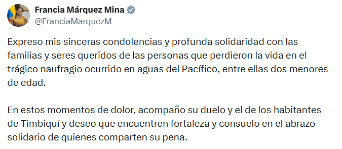 “Expreso mis sinceras condolencias y profunda solidaridad con las familias y seres queridos de las personas que perdieron la vida en el trágico naufragio ocurrido en aguas del Pacífico, entre ellas dos menores de edad”, escribió la vicepresidenta Márquez a través de su cuenta oficial en la red social X.