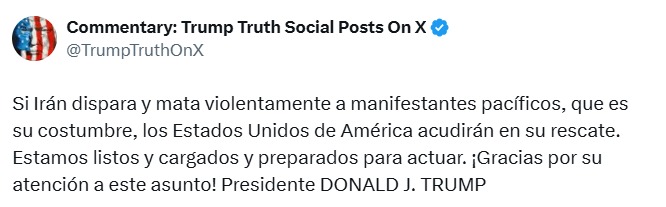 Trump se pronunció a través de su red social Truth Social, donde aseguró que Estados Unidos no permanecerá indiferente ante una eventual represión letal. “Si Irán dispara y mata violentamente a manifestantes pacíficos, como es su costumbre, Estados Unidos acudirá a su rescate”, escribió el mandatario, reiterando que su administración está lista para responder.