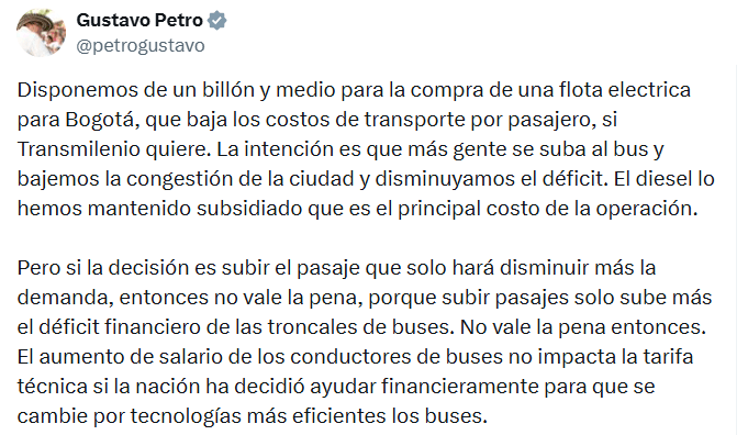 Petro también se refirió al aumento salarial de los conductores de buses, señalando que este factor no debería impactar la tarifa técnica si se avanza en el cambio tecnológico. Según indicó, la adopción de buses eléctricos permitiría compensar esos costos laborales mediante ahorros en combustible y mantenimiento.