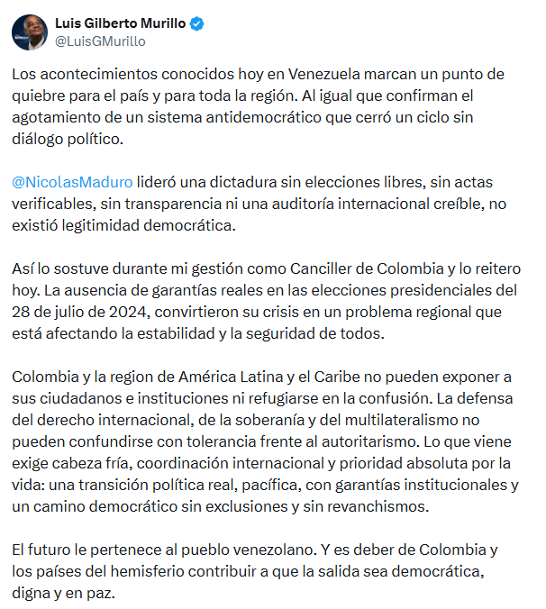 En un mensaje publicado en sus redes sociales, Murillo señaló que los acontecimientos registrados en Venezuela marcan «un punto de quiebre para el país y para la región«, al evidenciar el cierre de un ciclo caracterizado por la ausencia de elecciones libres, transparencia, auditoría internacional creíble y por la inexistencia de actas electorales verificables. El excanciller reiteró que, desde su perspectiva, la crisis venezolana dejó de ser un asunto interno y se convirtió en un problema regional con impactos directos en la estabilidad, la seguridad y la dinámica migratoria del hemisferio.