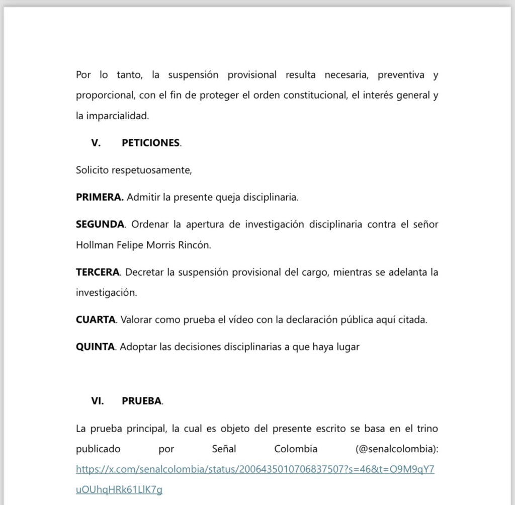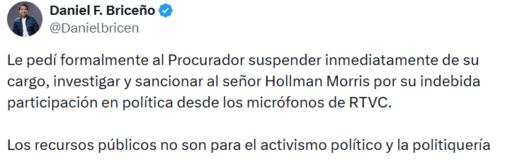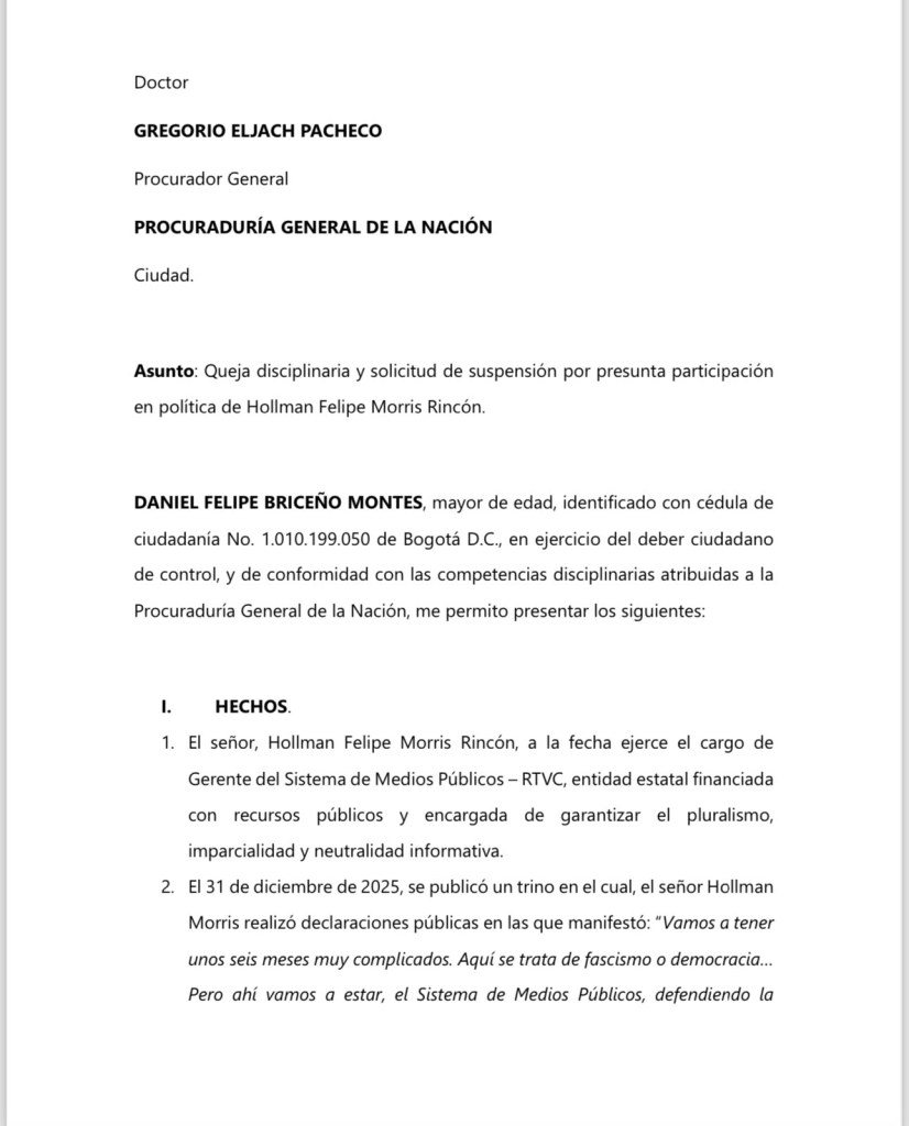Según el documento, Morris ejerce un cargo directivo en una entidad estatal financiada con recursos públicos, cuya función central es garantizar el pluralismo, la imparcialidad y la neutralidad informativa. En ese contexto, Briceño sostiene que el director de Rtvc habría utilizado su posición institucional para emitir valoraciones políticas que podrían influir en la opinión pública.