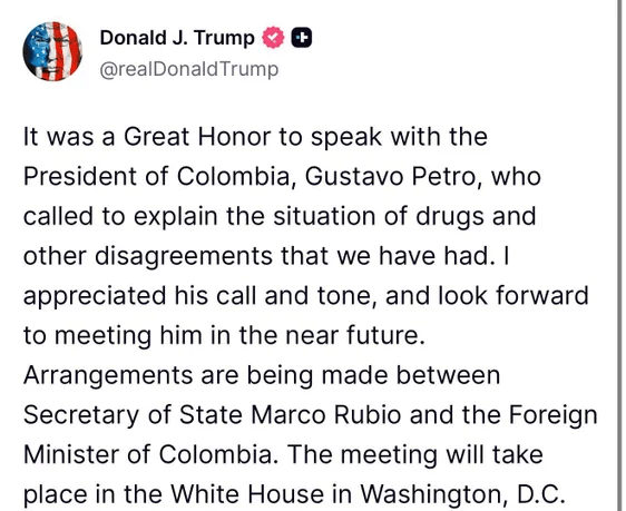 “Fue un gran honor hablar con el presidente de Colombia, Gustavo Petro, quien me llamó para explicar la situación de las drogas y otros desacuerdos que hemos tenido. Agradezco su llamada y su tono”, escribió el mandatario estadounidense. En el mismo mensaje, Trump confirmó que ambos gobiernos ya trabajan en la organización de un encuentro presencial en Washington D. C.