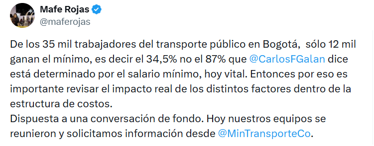 La ministra Rojas respondió a ese argumento y cuestionó la cifra central del planteamiento distrital. A través de la red social X, señaló que alrededor de 12.000 trabajadores reciben salario mínimo, lo que equivale al 34,5% del total, y no al 87% mencionado por Galán. Para la funcionaria, esa diferencia obliga a revisar con mayor rigor el peso real del aumento salarial dentro de la estructura de costos del sistema y a evitar conclusiones simplificadas.