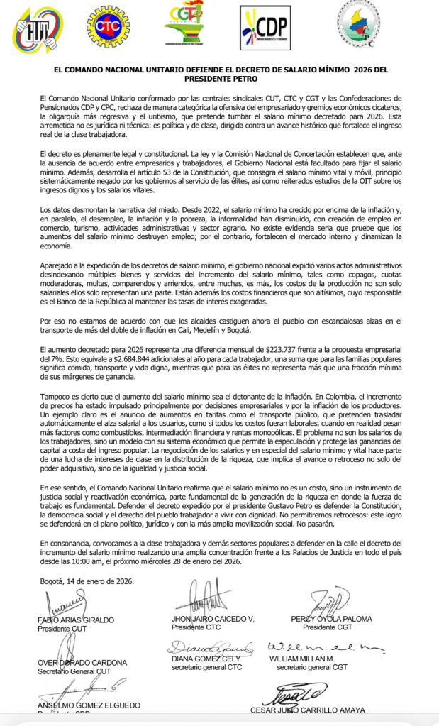 La convocatoria fue realizada por el Comando Nacional Unitario, integrado por la Central Unitaria de Trabajadores (CUT), la Confederación de Trabajadores de Colombia (CTC) y la Confederación General del Trabajo (CGT), junto con las confederaciones de pensionados CDP y CPC. Estas organizaciones han sostenido que el debate sobre el salario mínimo no es solo económico, sino social y político.