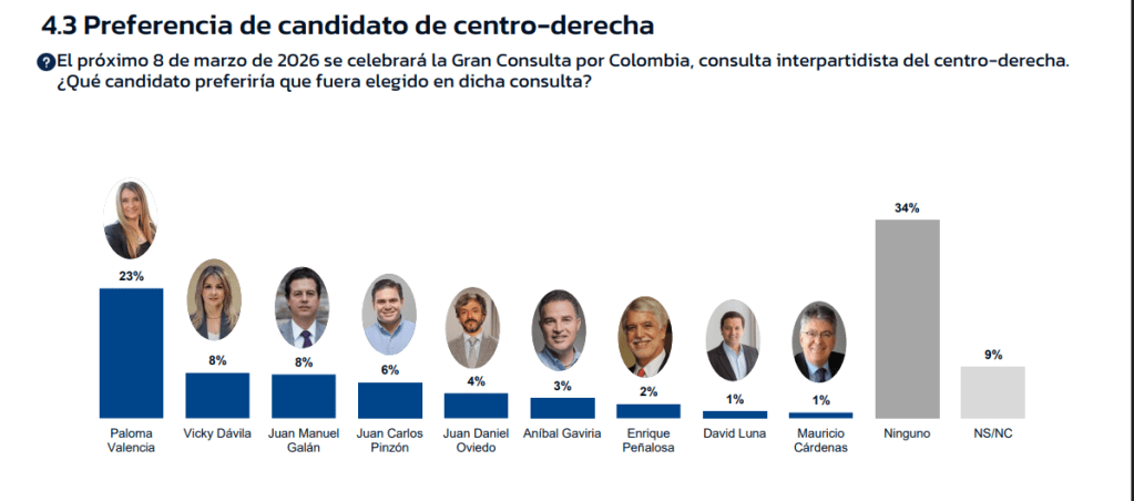 En la disputa interna de La Gran Consulta por Colombia, GAD3 perfila a Paloma Valencia como la figura con mayor respaldo dentro de este bloque. La senadora del Centro Democrático lidera con 23 % de intención de voto entre quienes se identifican con esta coalición, lo que le otorga una ventaja cómoda frente a sus competidores más cercanos.