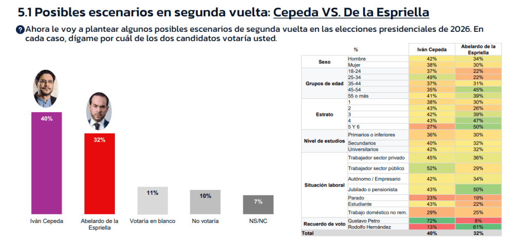 GAD3 también planteó tres duelos hipotéticos. En todos, Cepeda parte con ventaja: 40 % frente a 32 % de De la Espriella; 40 % frente a 25 % de Sergio Fajardo; y 43 % frente a 20 % de Paloma Valencia. En cada caso, el voto en blanco, la abstención y los indecisos siguen siendo factores decisivos.
