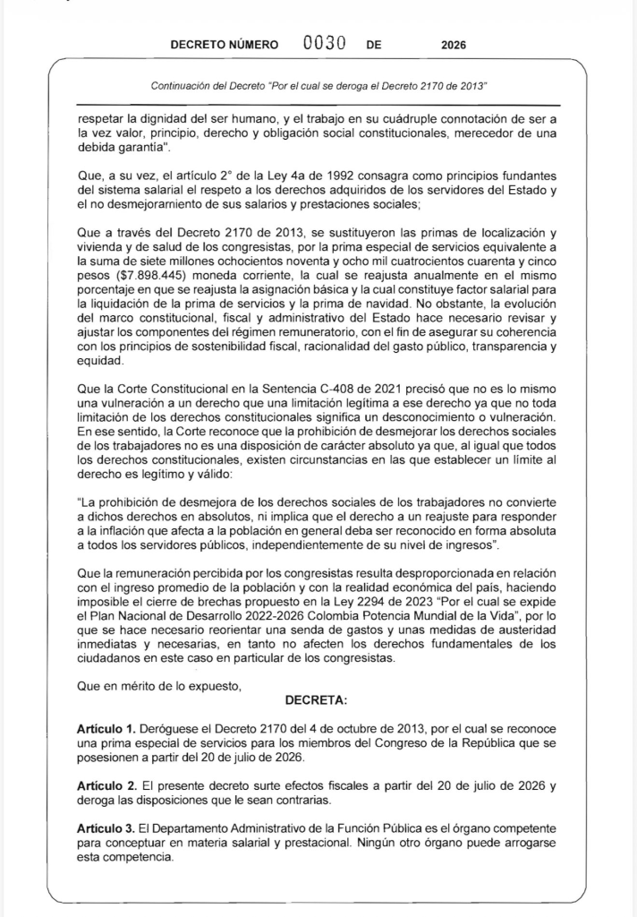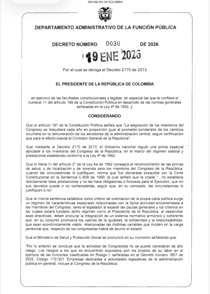 La decisión quedó consignada en el Decreto 0030 del 19 de enero de 2026, mediante el cual se deroga el Decreto 2170 de 2013, norma que había creado la prima especial de servicios como parte de la remuneración de senadores y representantes a la Cámara. El documento fue expedido por el Departamento Administrativo de la Función Pública y firmado por el presidente de la República junto con el ministro de Hacienda.
