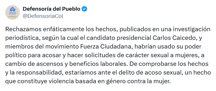 La Defensoría del Pueblo pidió a la Fiscalía General de la Nación y al Consejo Nacional Electoral investigar las denuncias de presunto acoso sexual que involucran al candidato presidencial Carlos Caicedo y a miembros del movimiento Fuerza Ciudadana.
