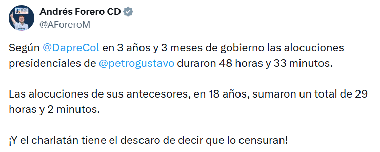 Forero divulgó los datos a través de sus redes sociales y cuestionó el uso reiterado de este mecanismo por parte del actual mandatario. Las alocuciones presidenciales están concebidas como un recurso excepcional para comunicar asuntos de especial relevancia nacional y se transmiten de manera obligatoria por los canales públicos y privados.