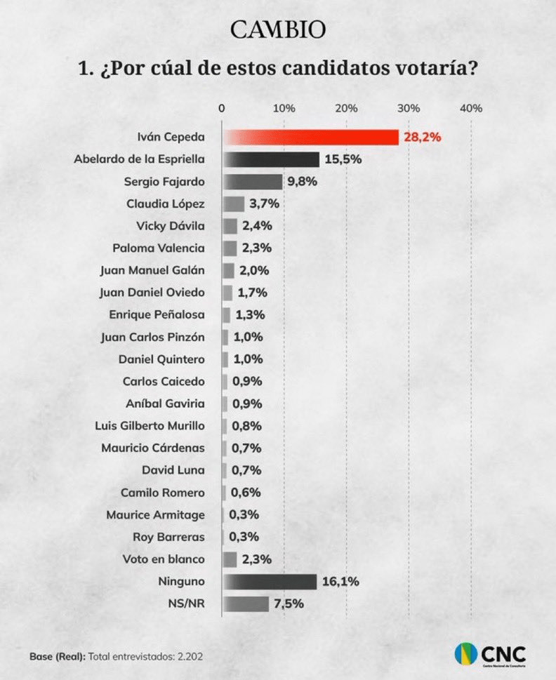 La más reciente encuesta del Centro Nacional de Consultoría (CNC), publicada por la revista Cambio, ubicó al senador Iván Cepeda como líder de la intención de voto presidencial con 28,2 %, seguido por Abelardo de la Espriella con 15,5 % y Sergio Fajardo con 9,8 %, según un sondeo realizado entre el 15 y el 21 de enero en 56 municipios y con 2.202 encuestados.