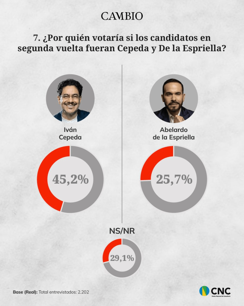 En simulaciones de segunda vuelta, Cepeda también lidera frente a sus posibles rivales. En un hipotético balotaje con De la Espriella, el candidato del Pacto Histórico alcanzaría el 45,2 % de la intención de voto frente al 25,7 % de su contrincante, aunque el 29,1 % de los encuestados se mantiene indeciso.