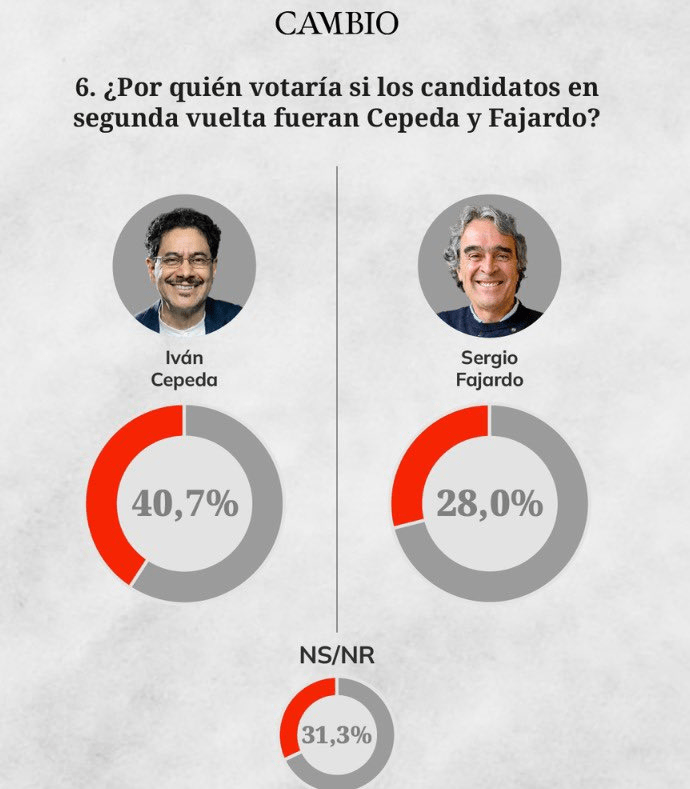 Frente a Fajardo, Cepeda obtendría 40,7 % frente al 28 % del exgobernador, con un porcentaje considerable de electores sin definición.