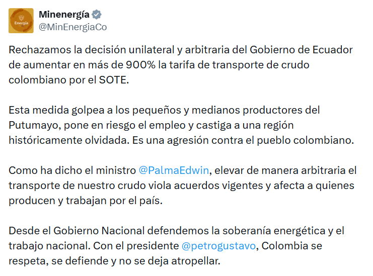 Ecuador aumentó en un 900 % la tarifa para el transporte de petróleo colombiano por el Sistema de Oleoducto Transecuatoriano (Sote), pasando de 3 a 30 dólares por barril, una medida que empezó a regir el 23 de enero y que impacta de forma directa a productores y exportadores de crudo en Colombia.
