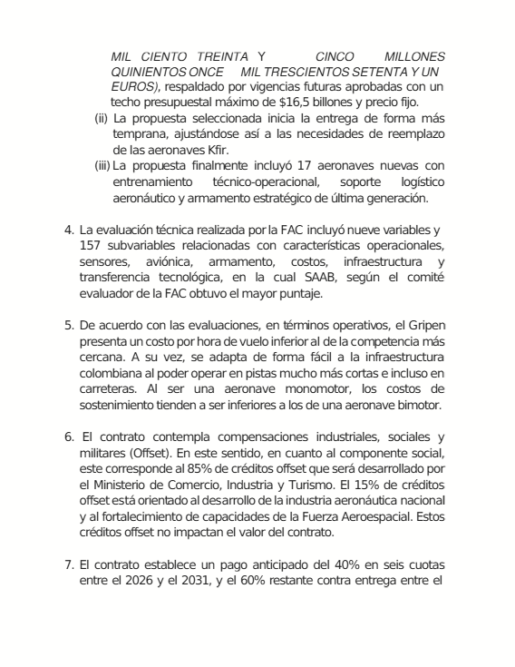 El contrato incluye entrenamiento técnico y operativo, soporte logístico y armamento estratégico. También contempla un esquema de compensaciones (offset) sin aumento en el valor del acuerdo: el 85% tendrá un componente social y el 15% estará destinado a fortalecer la industria aeronáutica nacional y las capacidades de la FAC.