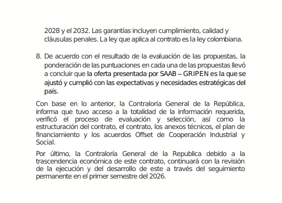 La Contraloría General de la República avaló el contrato para la adquisición de 17 aviones de combate Gripen, firmado con la empresa sueca Saab, tras concluir que el proceso se ajustó a las normas legales y respondió a las necesidades estratégicas de defensa del país.