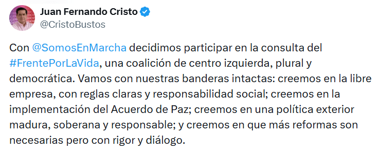 Juan Fernando Cristo confirmó que participará con su movimiento En Marcha en la consulta presidencial de la coalición de izquierda denominada Frente por la Vida, que se realizará el próximo 8 de marzo, y en la que también competirán Roy Barreras, Camilo Romero e Iván Cepeda, este último a la espera de que el CNE resuelva su situación jurídica.