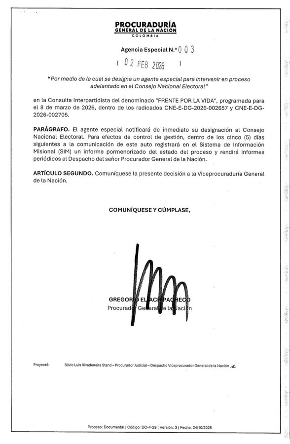 La medida fue adoptada mediante un auto firmado el 2 de febrero de 2026 por el procurador Gregorio Eljach y se conoció públicamente este martes. Según el documento, la designación responde a la relevancia institucional y electoral del caso y busca asegurar la intervención directa de la Procuraduría en una actuación administrativa de alto impacto.