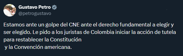 Cepeda rechazó la decisión y la calificó como una vulneración de los derechos políticos de su movimiento y de los ciudadanos que participaron en la consulta de 2025. Petro, por su parte, anticipó que el debate se trasladará a los estrados judiciales.