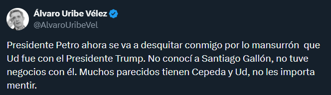 Uribe respondió que el presidente utiliza el asesinato de Gallón para “revivir mentiras” y “desquitarse” políticamente. Negó haber conocido al narcotraficante o haber tenido vínculos personales o comerciales con él, y señaló que los señalamientos carecen de sustento probatorio. En su réplica, también mencionó al senador Iván Cepeda, a quien acusó de acompañar una estrategia de desprestigio en su contra.