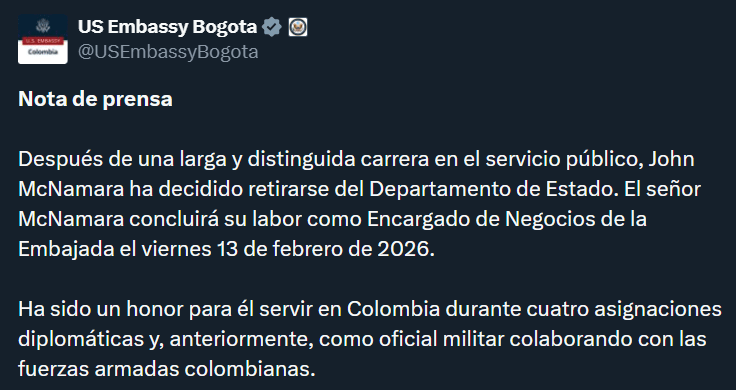 Bogotá, 4 de febrero de 2026 – John McNamara dejará la embajada de Estados Unidos en Colombia el próximo 13 de febrero, tras un año al frente de la misión diplomática en un periodo marcado por tensiones en la relación bilateral. A partir de esa fecha, la conducción de la sede en Bogotá quedará a cargo del ministro consejero Jarahn Hillsman, mientras Washington define un embajador en propiedad.