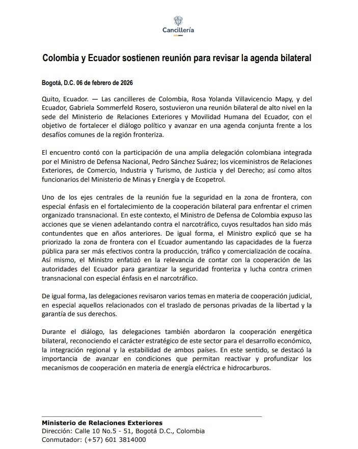 En materia de seguridad, la delegación colombiana defendió sus operaciones contra el narcotráfico y el crimen organizado en la frontera, argumentando resultados recientes “más contundentes que en años anteriores”, en respuesta a la narrativa ecuatoriana sobre falta de cooperación.
