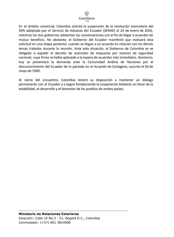 Bogotá/Quito, 7 de febrero de 2026 – Colombia decidió expedir el decreto de aranceles del 30% contra productos ecuatorianos y avanzar en una demanda ante el Tribunal de Justicia de la Comunidad Andina (CAN), luego de que la reunión bilateral de alto nivel celebrada el jueves en Quito terminara sin acuerdo para suspender el “tarifazo” impuesto por el presidente ecuatoriano Daniel Noboa a las exportaciones colombianas.