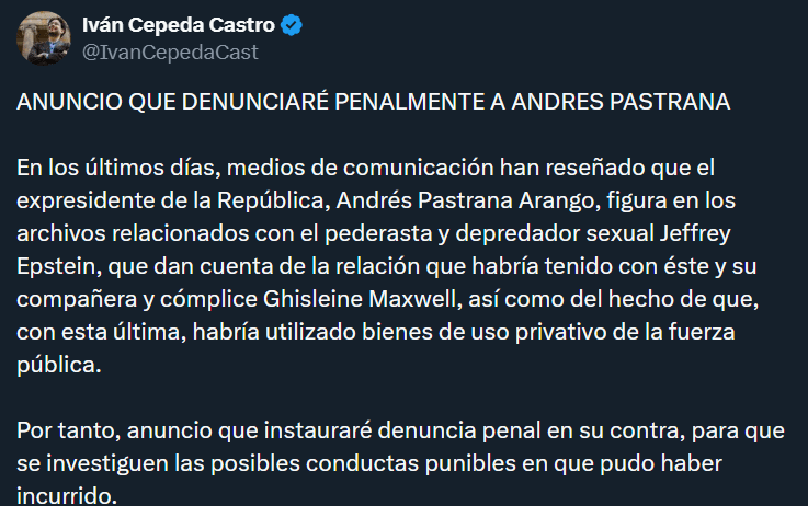 Bogotá, 9 de febrero de 2026 – El senador y precandidato presidencial, Iván Cepeda, anunció que presentará una denuncia penal contra el expresidente Andrés Pastrana tras la divulgación de documentos judiciales en Estados Unidos que vuelven a mencionar al exmandatario colombiano dentro del expediente del pedófilo Jeffrey Epstein, condenado por tráfico sexual de menores.
