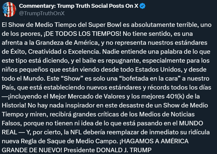 En un mensaje publicado en Truth Social minutos después del evento, afirmó que el show “no tiene sentido” y que es “un atentado contra la grandeza de América”. También cuestionó que la presentación fuera en español al señalar que “nadie entiende una palabra de lo que este tipo está diciendo” y consideró inapropiadas algunas coreografías para audiencias infantiles.