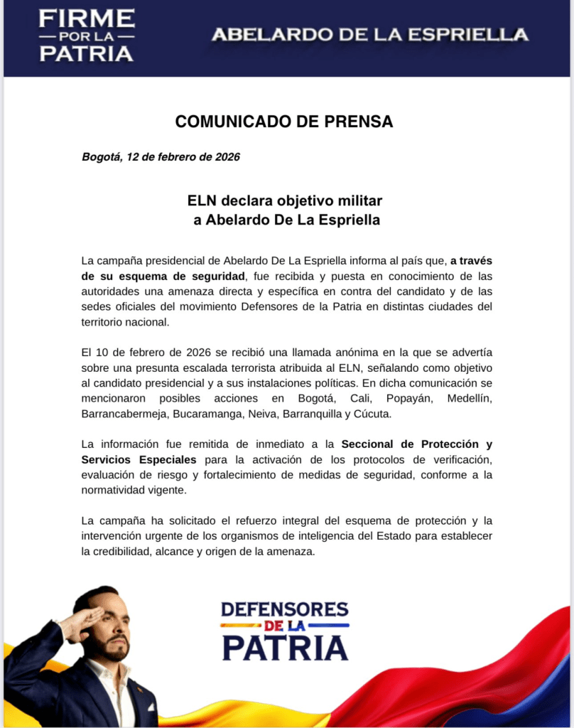 Bogotá, 12 de febrero de 2026 – El abogado y precandidato presidencial Abelardo De la Espriella denunció que fue declarado “objetivo militar” por el ELN y solicitó a las autoridades reforzar su esquema de protección y evaluar posibles riesgos contra él y sedes de su movimiento en distintas ciudades del país.