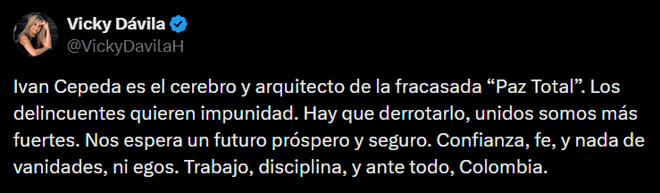 En el trino, Dávila afirmó que “Iván Cepeda es el cerebro y arquitecto de la fracasada ‘Paz Total’”, y añadió que la estrategia habría favorecido la impunidad de estructuras criminales. El mensaje concluye con un llamado a la unidad contra su eventual aspiración presidencial: “Hay que derrotarlo, unidos somos más fuertes”, acompañado de una apelación a seguridad y prosperidad como ejes de campaña.