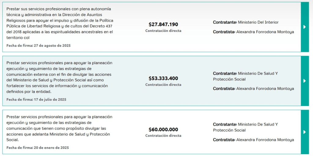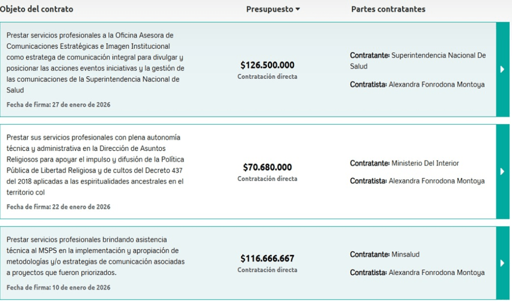 Según la documentación divulgada por Pedraza, Alexandra Fonrodona Montoya, madre de la ministra, habría sido contratada por al menos tres entidades: la Superintendencia Nacional de Salud, el Ministerio de Salud y el Ministerio del Interior.