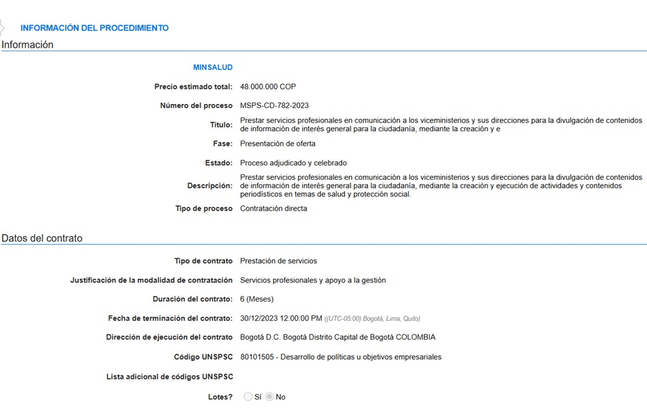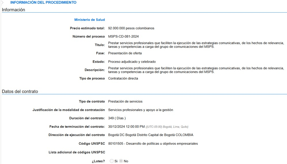 - Ministerio de Salud: contrato cercano a $116 millones para asistencia técnica en la implementación de metodologías y estrategias de comunicación.