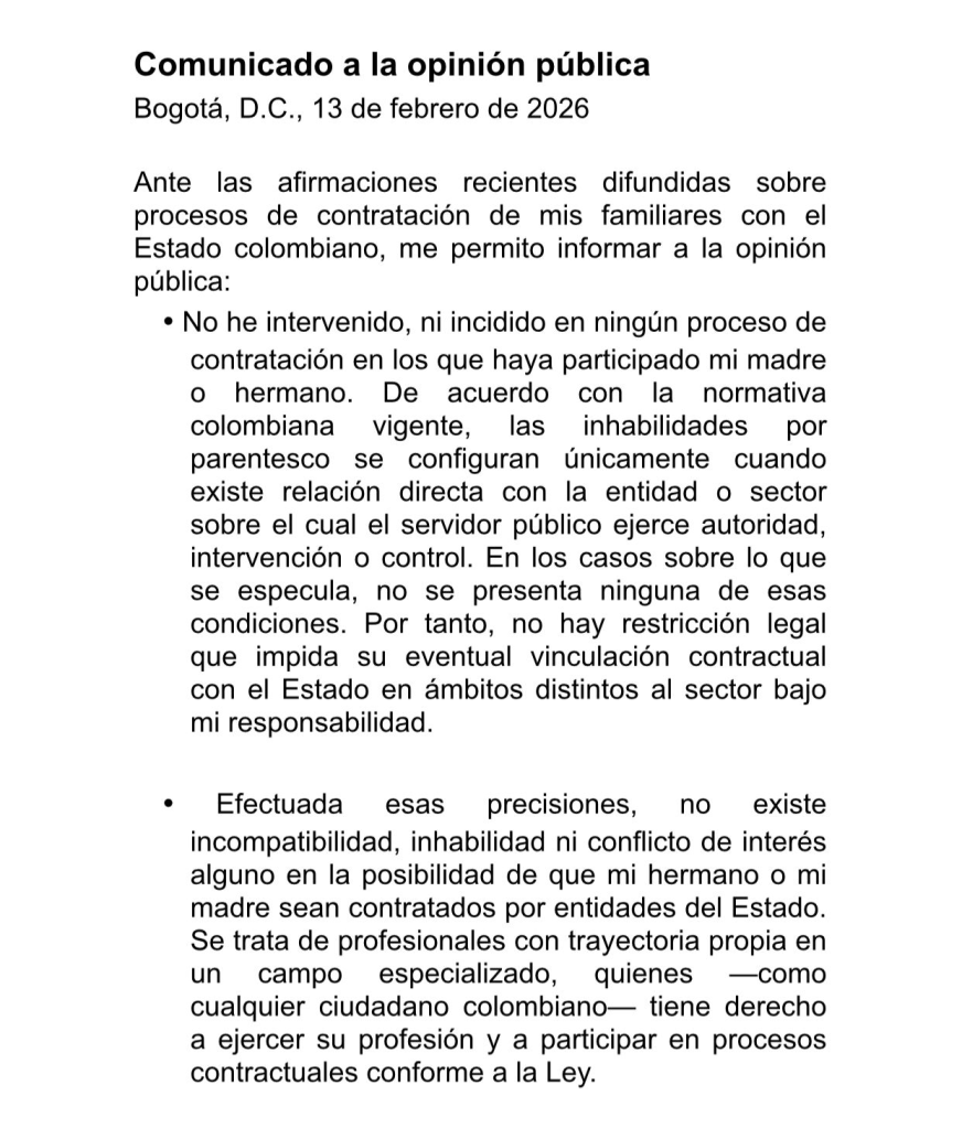 Pedraza sostuvo en redes sociales que “no solo es el hermano” y que la madre de la ministra habría recibido seis contratos durante este gobierno. Además, adjuntó registros de contrataciones previas: uno en 2023 por cerca de $48 millones, uno en 2024 por $92 millones y tres en 2025 por aproximadamente $141 millones.