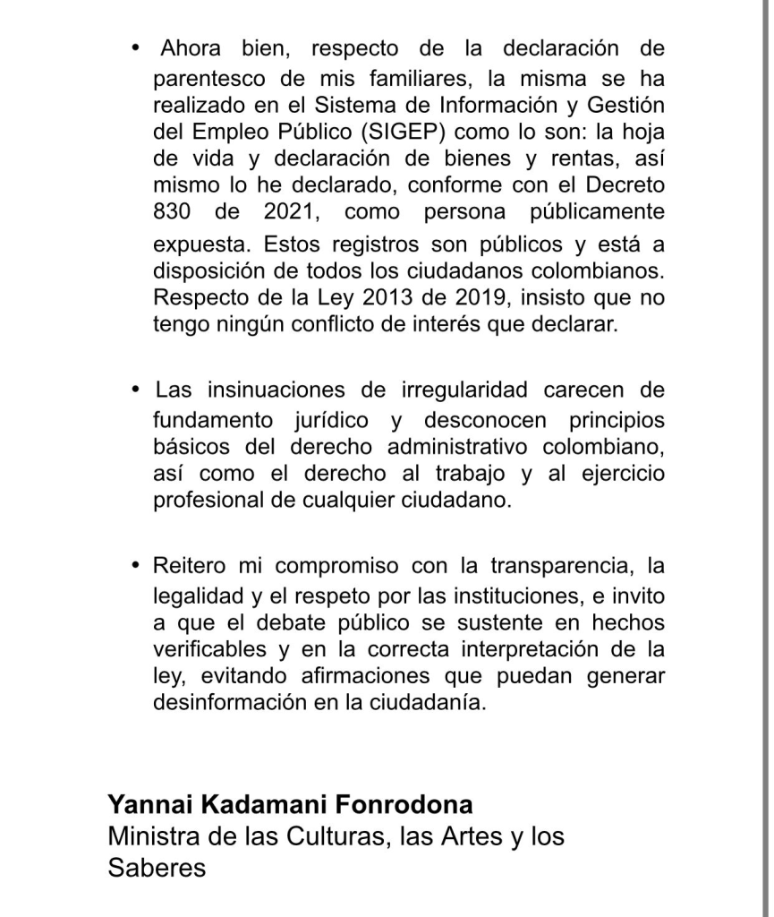 También explicó que los parentescos están reportados en el Sistema de Información y Gestión del Empleo Público (SIGEP) y que esa información es pública. Según Kadamani, sus familiares son “profesionales con trayectoria propia” que pueden participar en procesos contractuales conforme a la ley.