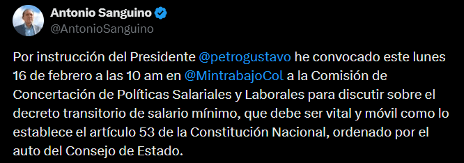 Sanguino señaló que el decreto transitorio debe respetar el principio constitucional de salario mínimo “vital y móvil”, mientras se alcanza una decisión definitiva en el proceso judicial. El nuevo valor regirá temporalmente hasta que el tribunal emita sentencia de fondo.