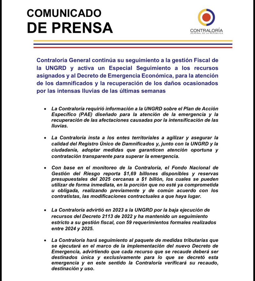El ente de control recordó que el Fondo Nacional de Gestión del Riesgo dispone actualmente de cerca de 1,69 billones de pesos para 2026 y aproximadamente 1 billón adicional de vigencias anteriores, recursos que pueden ejecutarse de inmediato mientras se materializa el nuevo recaudo.