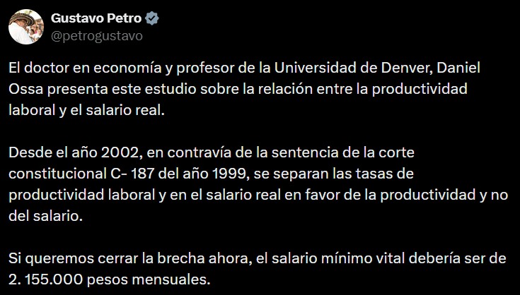 Petro señaló que, desde 2002, la productividad laboral ha crecido por encima de la remuneración de los trabajadores. Con base en el estudio citado del economista Daniel Ossa, el Ejecutivo considera que esa diferencia ha deteriorado el poder adquisitivo y ampliado la desigualdad. El objetivo del llamado “salario mínimo vital” sería cerrar esa brecha entre crecimiento económico e ingresos laborales.