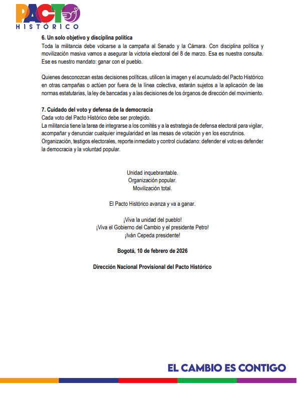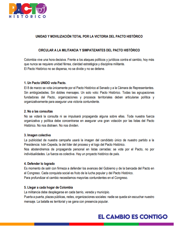 La circular, divulgada entre dirigentes y bases, instruye concentrar toda la movilización electoral en las listas cerradas al Congreso bajo el lema “Un solo voto, Pacto Histórico” y con la imagen presidencial de Iván Cepeda. El documento ordena expresamente no votar las consultas ni hacer propaganda de ellas y advierte sanciones disciplinarias a quienes desconozcan la línea oficial, con base en la ley de bancadas y los estatutos internos.
