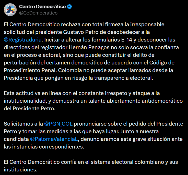 La controversia se amplificó cuando el Centro Democrático acusó al presidente de incitar a desobedecer a la autoridad electoral y anunció acciones ante la Procuraduría por posible perturbación del certamen democrático. Con ello, el debate dejó de ser exclusivamente técnico y entró en el terreno disciplinario y penal, elevando el costo político de cada declaración.