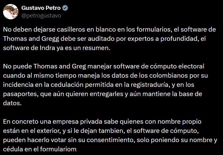 Petro leyó esa instrucción desde otra óptica. En varios mensajes públicos afirmó que no deben existir espacios sin diligenciar porque podrían llenarse después de manera irregular. Vinculó ese riesgo con el hecho de que el software de transmisión y cómputo está en manos de Thomas Greg & Sons, empresa que también ha manejado contratos de identificación y pasaportes. A su juicio, la concentración de funciones críticas en un mismo conglomerado crea un “peligro de corrupción” que exige auditorías independientes y revisión del modelo de contratación.