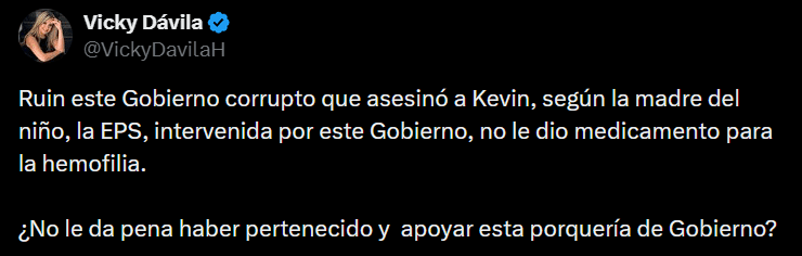 Dávila, periodista y hoy aspirante a la Presidencia, sostuvo que el Ejecutivo es responsable directo del fallecimiento porque Nueva EPS, intervenida por la Superintendencia de Salud desde 2024, no habría garantizado el suministro continuo del medicamento Emicizumab que el menor requería para prevenir hemorragias. En sus mensajes calificó al gobierno como corrupto y afirmó que la omisión en la entrega del fármaco equivale a un “asesinato”.