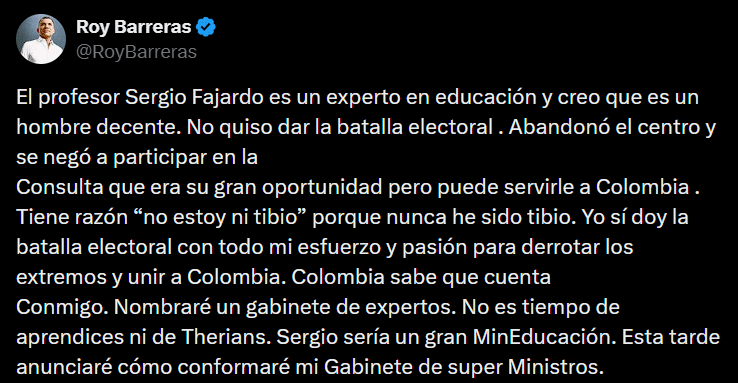 Fajardo respondió desde su cuenta oficial en X con una frase breve y categórica. “No está ni tibio” condensó su rechazo a la posibilidad de integrar un eventual gabinete encabezado por Barreras. La contundencia del mensaje no solo descarta la oferta, también reafirma su decisión de mantener una candidatura independiente de cualquier consulta interpartidista y de construir una alternativa propia para la primera vuelta de 2026.
