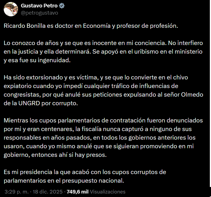 En contexto: Petro defiende a Ricardo Bonilla luego de que tribunal ordenara su reclusión