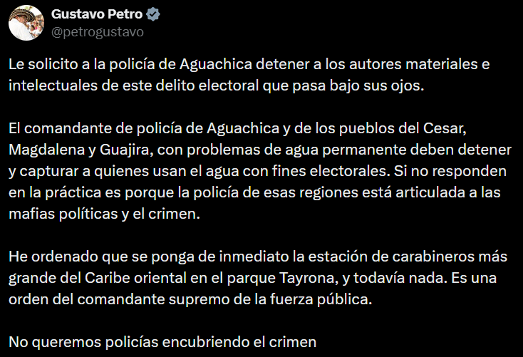 Petro afirmó en su cuenta de X que se estaría usando el agua “con fines electorales” y pidió capturar a los “autores materiales e intelectuales”. Fue más allá al advertir que, si no hay reacción, podría interpretarse como articulación entre fuerza pública y estructuras políticas regionales. Con esa declaración introduce un componente de presión directa sobre la Policía en Cesar, Magdalena y La Guajira, departamentos que también enfrentan crisis recurrentes de abastecimiento.