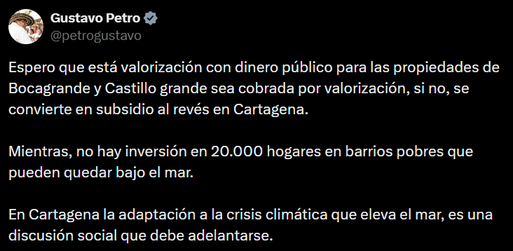 El mensaje del mandatario fue directo. “Espero que esta valorización con dinero público para las propiedades de Bocagrande y Castillogrande sea cobrada por valorización, si no, se convierte en subsidio al revés en Cartagena”, escribió en su cuenta de X. Añadió que, mientras se destinan cerca de 168.000 millones de pesos a esos barrios, hay 20.000 hogares en sectores populares que “pueden quedar bajo el mar”. La frase condensó una tensión latente en la ciudad, la brecha entre zonas turísticas de alta plusvalía y barrios costeros vulnerables al aumento del nivel del mar.