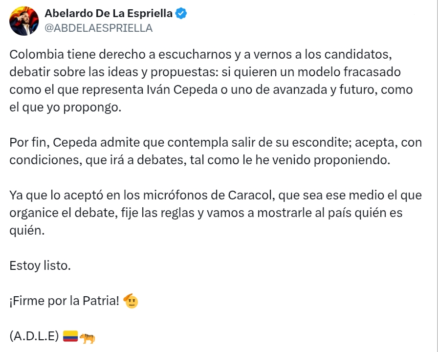 Esa precisión no es neutra. Desde comienzos de 2026, De la Espriella ha construido su campaña alrededor de la idea de un duelo directo con Cepeda, a quien presenta como continuidad del proyecto de Gustavo Petro. En entrevistas y mensajes en redes sociales, ha asegurado que la elección se definirá entre ambos y ha citado encuestas en las que figuran en los primeros lugares de intención de voto. En ese marco, los debates no son solo un formato, sino el escenario simbólico donde busca consolidar la imagen de dos orillas enfrentadas.